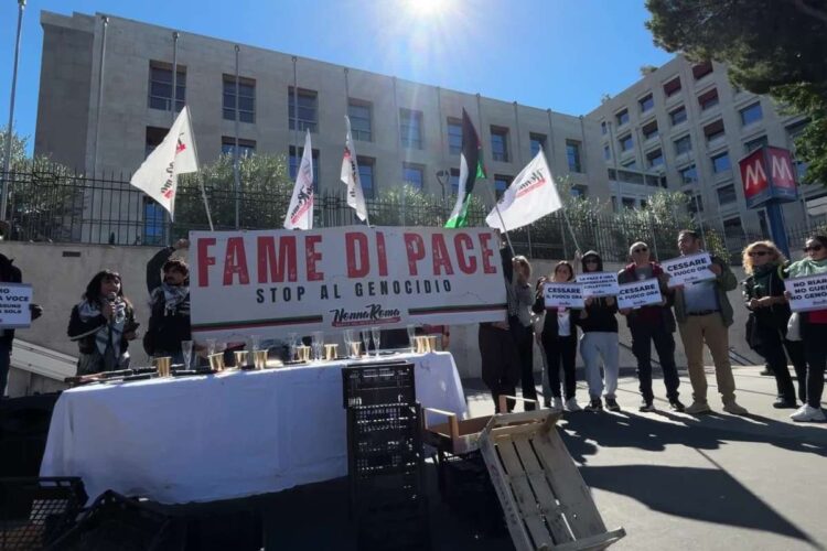 Gli attivisti di Nonna Roma hanno voluto rappresentare attraverso questa potente immagine l’assurdità di un mondo in cui, di fronte a tavole lussuose e a una apparente serenità occidentale, milioni di persone vivono in condizioni di estrema povertà e carestia. “Siamo arrivati a più di mezzo milione di persone in carestia e oltre un milione in emergenza umanitaria”, hanno dichiarato i manifestanti, evidenziando come la libertà e il benessere delle società occidentali non possano più essere disgiunti dalla libertà dei palestinesi.