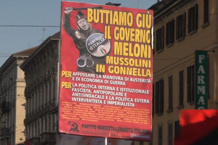 L’atmosfera in piazza era segnata anche da cartelli fortemente critici nei confronti del governo, in particolare un manifesto raffigurante la presidente del Consiglio Giorgia Meloni in divisa fascista, definita “Mussolini in gonnella”.
