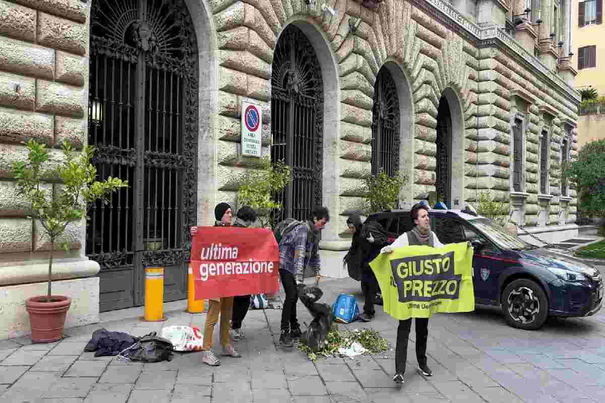 Blitz di Ultima Generazione al ministero dell’Agricoltura a Roma: sei attivisti hanno protestato lasciando scarti di verdura e srotolando striscioni con le scritte “Ultima Generazione” e “Giusto Prezzo”. Hanno criticato l’inazione del governo nella tutela dell’agricoltura italiana.