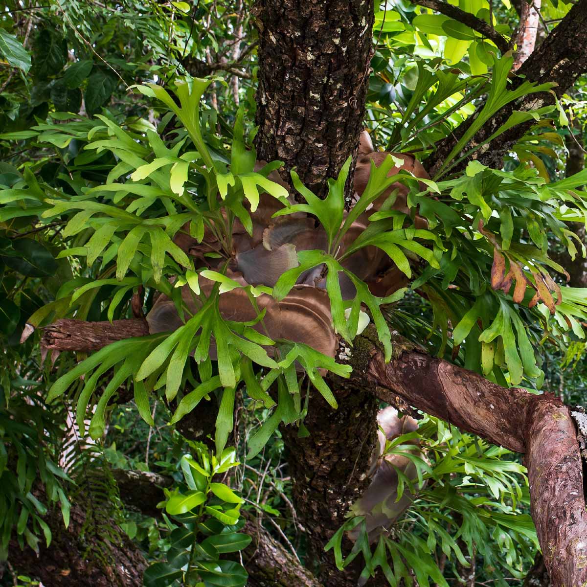 Il Platycerium appartiene alla famiglia delle Polypodiaceae e, nonostante l’aspetto inizialmente ingannevole, non ha nulla a che vedere con le piante succulente. La sua struttura è il risultato di un’evoluzione che l’ha portato a vivere come pianta epifita, cioè una specie che cresce su altre piante senza sottrarre loro nutrienti. Nelle foreste del Sud America, dell’Africa, dell’Asia sud-orientale, dell’Australia e della Nuova Guinea, questa felce si insedia nelle biforcazioni dei tronchi dove trova una piccola quantità di detriti organici necessari alla sopravvivenza. È qui che sviluppa un apparato radicale molto contenuto, nato da un rizoma centrale, mentre la pianta organizza la sua crescita sfruttando lo spazio in verticale.